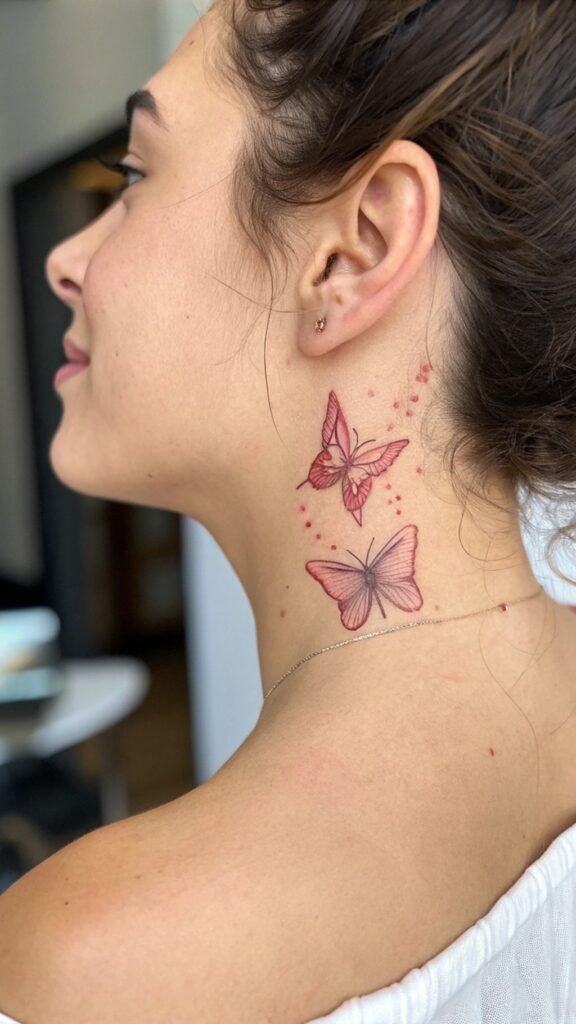 Sites like Inku Paw highlight butterflies as a top feminine choice. They’re easy to scale down—a tiny one near your ear or a slightly larger one on the nape works beautifully. Black ink keeps it sleek, but soft pastels like blue or purple add a dreamy vibe. I love how a butterfly’s wings can curve with your neck’s natural shape!