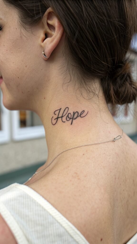 Words hold power, and a dainty script tattoo on your neck proves it. Think of a single word like “Hope” or a short phrase like “Be You” in a flowing font. It’s personal and subtle, yet it says so much.