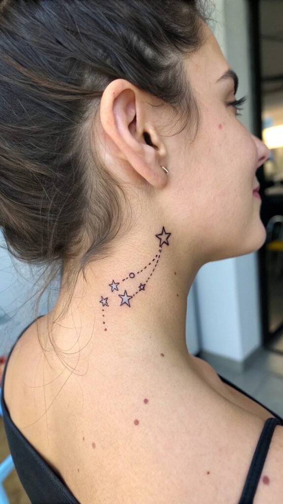 Stars light up the sky, and a small constellation tattoo can light up your neck. A few tiny stars connected by thin lines look magical and delicate. It’s a nod to the universe without taking up much space.