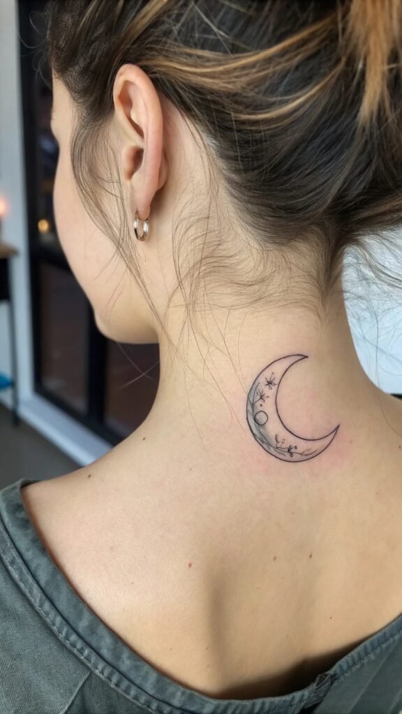 Pain is light, especially on thicker skin areas like the back of the neck. Aftercare is easy—moisturize and skip the sun. This tattoo feels like a peaceful night etched onto you, a lovely pick for 2025’s vibe!