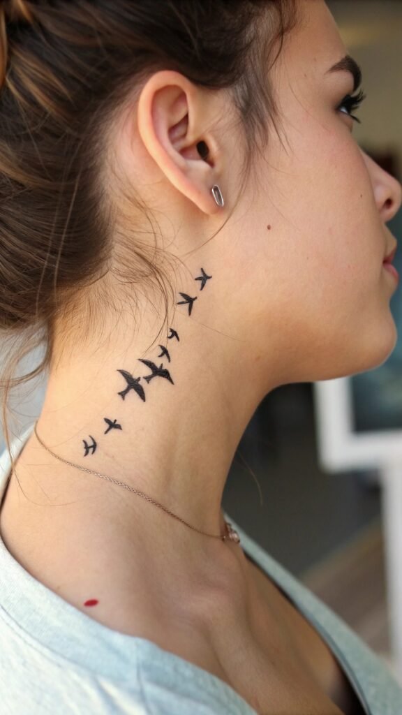 Birds mean freedom and spirit, and a petite bird tattoo fits the delicate bill. A single bird or a small flock in flight looks graceful on your neck. It’s light and full of life.
