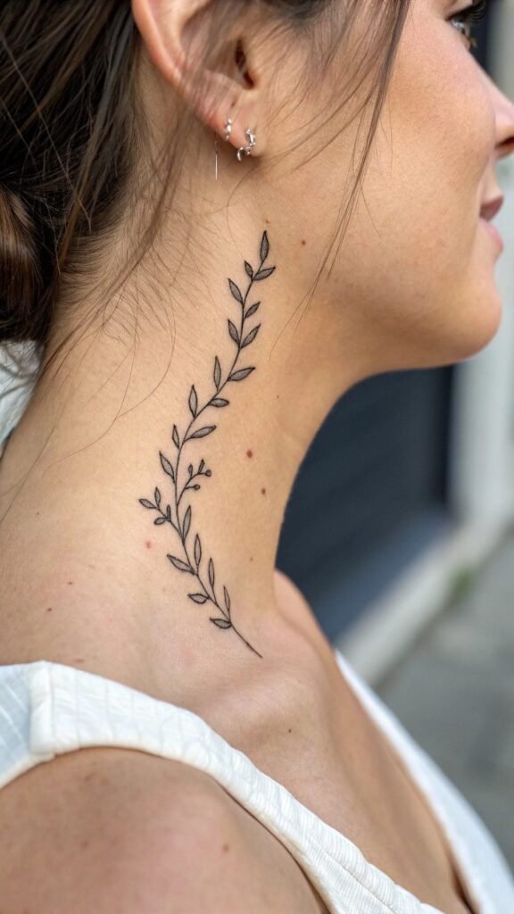 TattooBuild praises vines for flowing with the body, and they’re right—your neck’s curve loves this. Start at the side or nape and let it creep a little. Black ink is sleek, but green hints feel alive.