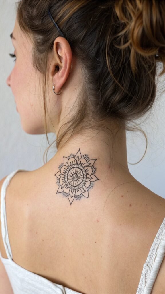 StyleCraze lists mandalas as a bold yet feminine pick, and scaled down, they’re pure elegance. Place it on the nape for symmetry or the side for a peek. Black ink shines, but soft colors like lavender add warmth.