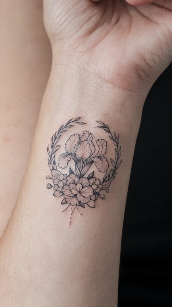 As you envision an iris tattoo, consider encircling yourself with an intricate iris floral wreath design that blooms with elegance.