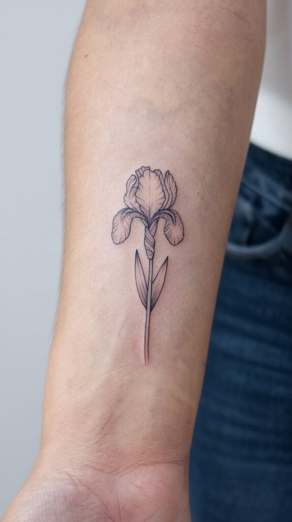 In the quiet spaces between bold statements, a subtle beauty lies in wait, and the minimalist iris stem tattoo idea is its perfect embodiment.